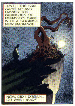 "Dermod's Bane" is the best re-telling of the three stories Cross Plains Comic offered in the first issue of Myth Maker. The art is excellent, stylish, and brooding. The text was taken directly from the original story, and included all the appropriate dramatic clues. The story adaptation is excellent, but the story itself is not one of Howard's best. Trite and worn out by over use, Howard's wording, scene settings, and plot are not bad, but not exciting either. This was yet another of the shortest stories from Howard's repertoire.