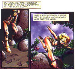 Spear and Fang Roy Thomas: writerRichard Corben: artist Eric Hope: color and rendering "Spear and Fang" first appeared in the July 1925 issue of Weird Tales magazine. This story was Robert E. Howard's first professionally published tale, and he wrote it when he was nineteen. It is a tale of a Cro-Magnon cave man, his female admirer, a competitor for her affections, and a savage battle against a more beastly Neanderthal man who also has designs on the woman. Initially, the distinct style of the artwork seemed a bit hokey; more akin to the wacky art found in the old Mad Magazines -- bulky, stretched, distorted, out of proportion -- but after a while I got used to the style and, when considering the primitive subject matter, this art style seems somehow appropriate. I then tried to sit back and let the story flow. Unfortunately, that proved impossible. The story is afflicted with poor transitions from scene to scene, which serve to stop the action and shock the reader out of the drama. The coherence and continuity of the story is poor as well. Many times I asked my self, "who is this guy?", "why is he there?," "why would he do that?," "what is she doing there?" etc. Then intertwined with all this is a lack of character development which prevents the reader from caring about the characters. Most of this could easily have been avoided with three or four additional panels and about 20 additional words from Howard's text. Here's some specifics: