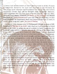 Since no captions have been placed under any of the photographs, several pictures will be incomprehensible to the average person, unless they have more than a little knowledge of Howard (examples are the picture of Novalyne, or the picture of the Cleopatra statue Howard bought in New Orleans). Again, another technique that could have unified and deepened the book's immersion-level went unused, and the book suffers as a result. Then we get to